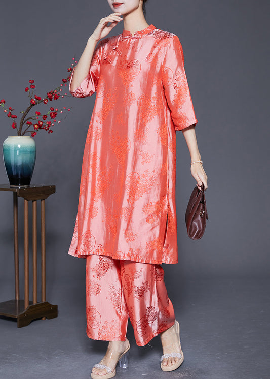Plus Size Pink Chinese Button Jacquard Silk 2 Piece Outfit Summer LY5374