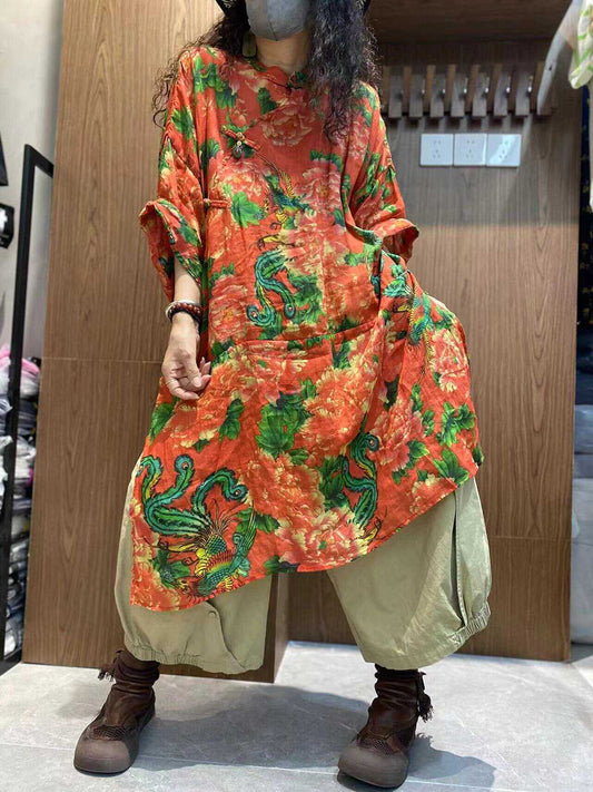 Plus Size Women Summer Vintage Flower V-Neck Ramie Long Shirt II1060