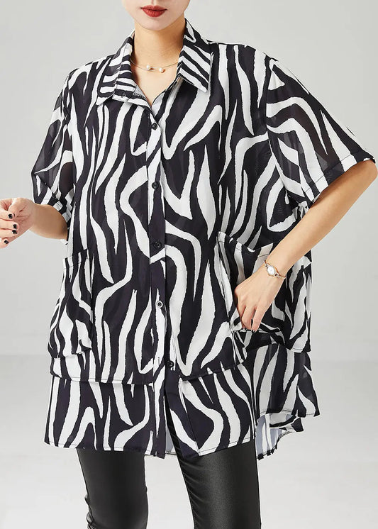 Italian Black O Neck Print Patchwork Chiffon Shirts Tops Bracelet Sleeve TF1016
