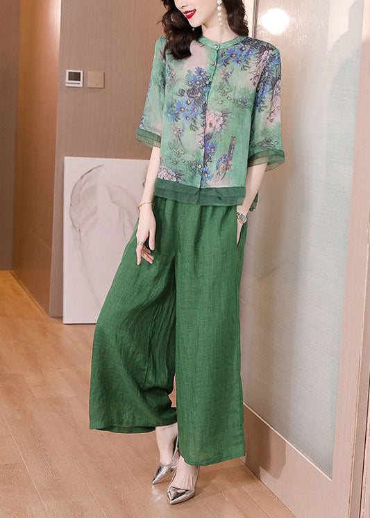 Boho Green Stand Collar Patchwork Print Linen Two Piece Set Women Clothing Summer LY2723