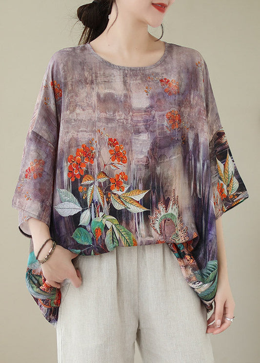 Boho Light Purple O-Neck Print Linen Top Long Sleeve LY2952