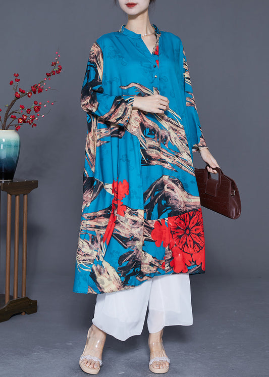 Organic Blue Mandarin Collar Print Lace Up Silk Long Dresses Summer LY5394