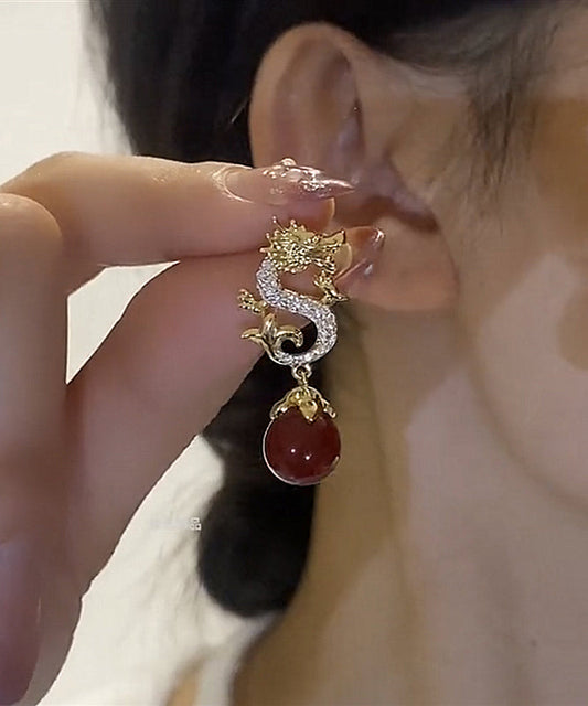Chinese Style Red Sterling Silver Overgild Zircon Pearl Dragon Shaped Drop Earrings YX013