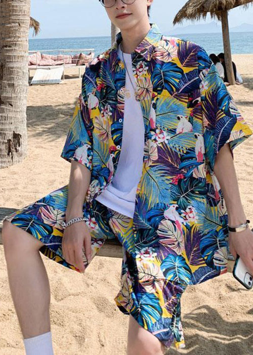 Beach Blue Peter Pan Collar Print Ice Silk Men Two Pieces Set Summer HG059