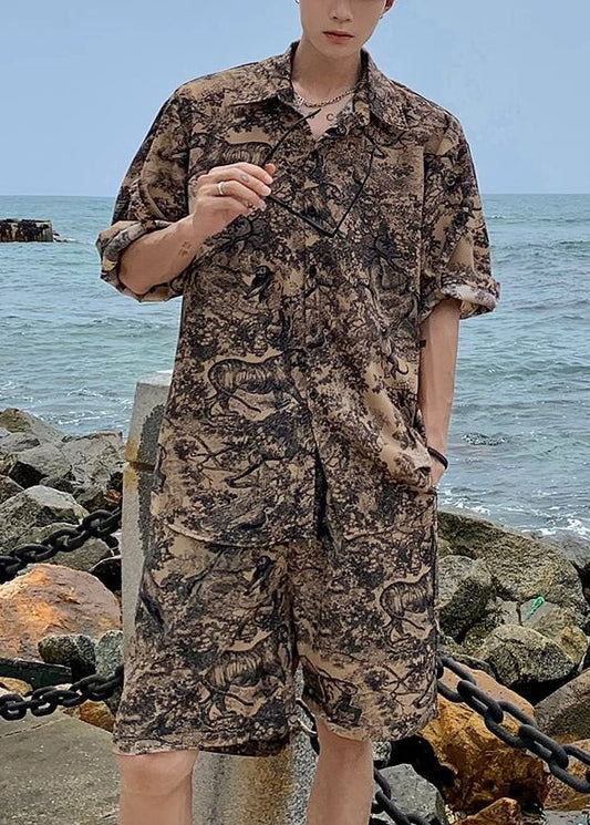 New Beige Print Elastic Waist Ice Silk Mens Two Piece Set Short Sleeve HG070
