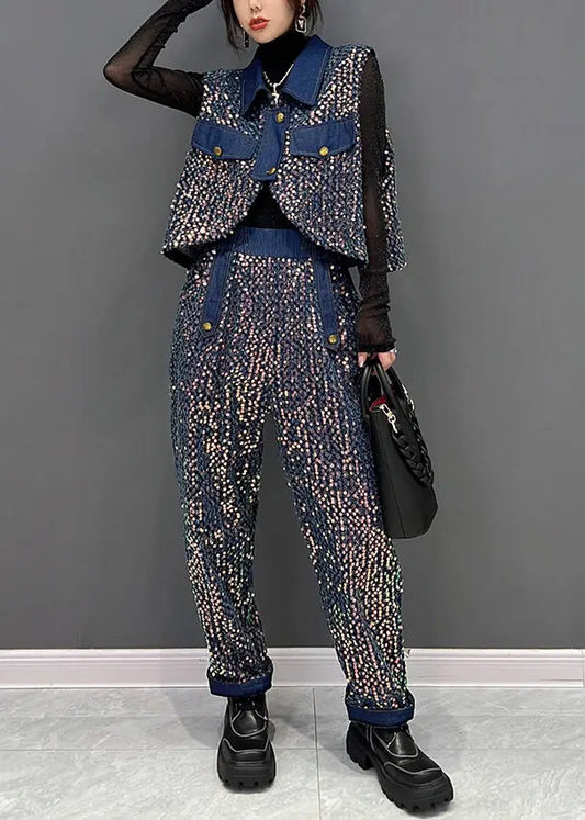 French Blue Sequins Tops And Pants Denim Two Piece Suit Set Fall ML3109