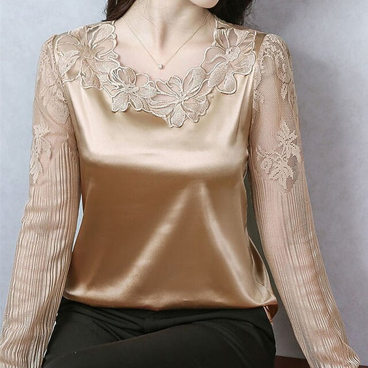 Women's Shirt Elegant Satin Top Blouse Lace Patchwork
