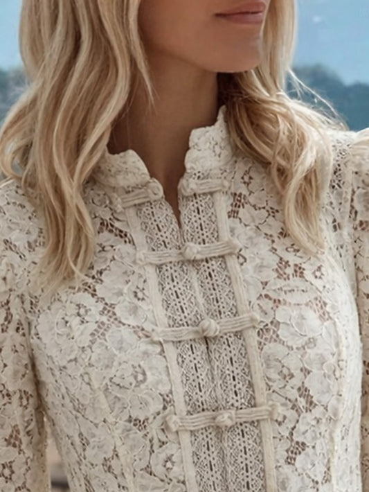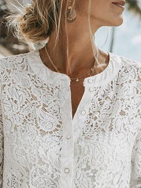 Women's Blouse Lace Buttons Solid Color Stylish Casual Long