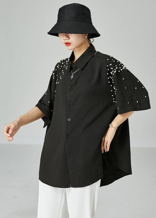 Handmade Black Oversized Nail Bead Jacquard Cotton Blouses Short Sleeve LY2468