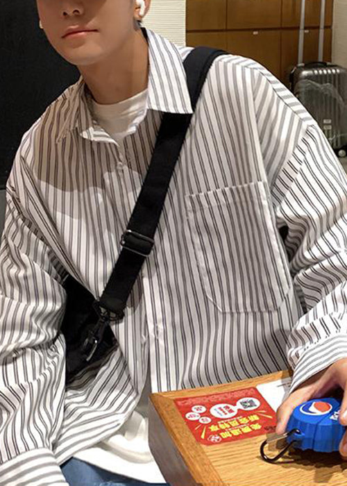 White Striped Pockets Cotton Mens Shirt Peter Pan Collar Spring