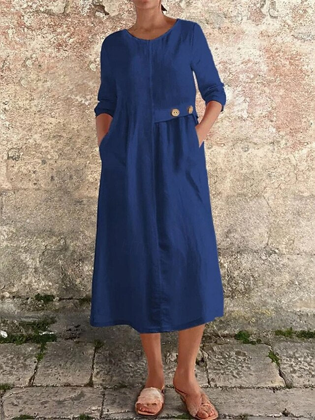 Dresses Type: Casual Dress, Cotton Linen Dress, Fabric: Cotton, Linen, Gender: Women's, Design: Pocket, Buttons, Occasion: Date, Daily, Weekend, Style: Fashion, Modern, Fit Type: Regular Fit, Dress Length Type: Long Dress Maxi Dress, Neckline: Crew Neck, Sleeve Length: Long Sleeve, Elasticity: Micro-elastic, Look After Me: Machine wash, Pattern: Plain, Season: Fall, Spring,