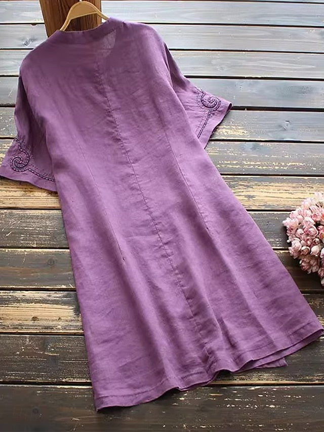 Dresses Type: Faux Cotton Linen, Casual Dress, Fabric: Polyester, Linen texture style, Gender: Women's, Occasion: Vacation, Daily, Design: Embroidered, Style: Vintage, Casual, Stylish, Fit Type: Regular Fit, Dress Length Type: Long Dress Maxi Dress, Neckline: Stand Collar, Sleeve Length: Short Sleeve, Elasticity: Micro-elastic, Look After Me: Hand wash, Machine wash, Pattern: Floral, Season: Summer,