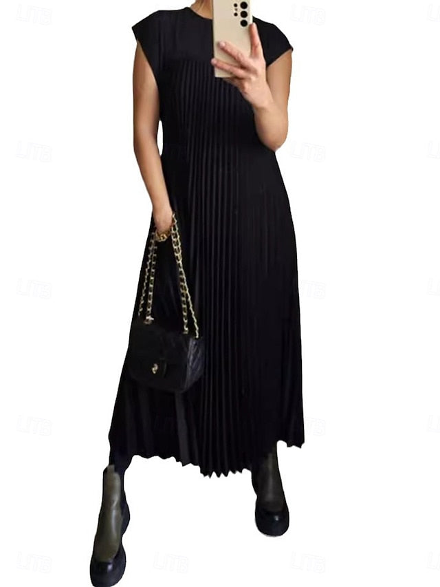 Dresses Type: Casual Dress, Fabric: Polyester, Gender: Women's, Occasion: Office, Daily, Party, Design: Pleated, Size Suggestion: standard size, select your usual size, Style: Streetwear, Fashion, Fit Type: Regular Fit, Dress Length Type: Maxi Dress, Neckline: Crew Neck, Sleeve Length: Sleeveless, Elasticity: Micro-elastic, Look After Me: Machine wash, Pattern: Solid Color, Season: Summer,