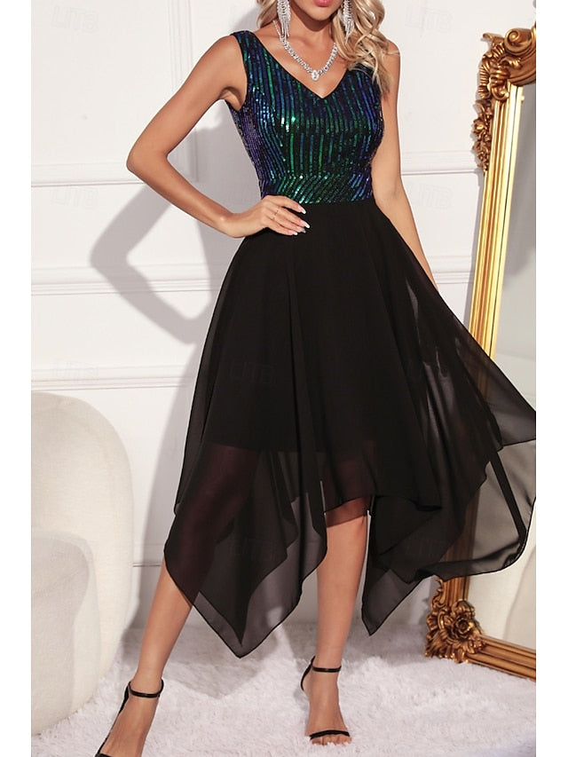 Dresses Type: Elegant Dress, Sequin Dress, Party Dress, Fabric: Polyester, Gender: Women's, Design: Patchwork, Sparkly, Asymmetrical, Glitter, Occasion: Party, Evening Party, Style: Fashion, Fit Type: Regular Fit, Dress Length Type: Midi Dress, Neckline: V Neck, Sleeve Length: Sleeveless, Elasticity: Micro-elastic, Look After Me: Hand wash, Pattern: Color Block, Season: Summer,