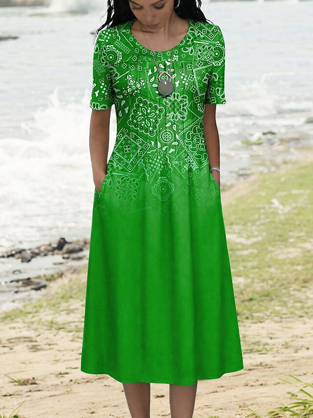 Dresses Type: Summer Dress, T Shirt Dress Tee Dress, A Line Dress, Fabric: Polyester, Gender: Women's, Design: Print, Occasion: Daily, Style: Casual, Vacation, Fit Type: Regular Fit, Dress Length Type: Midi Dress, Neckline: Crew Neck, Sleeve Length: Short Sleeve, Half Sleeve, Elasticity: Inelastic, Look After Me: Hand wash, Dry clean only, Machine wash, Pattern: Graphic, Tribal, Ombre, Season: Summer, Spring,