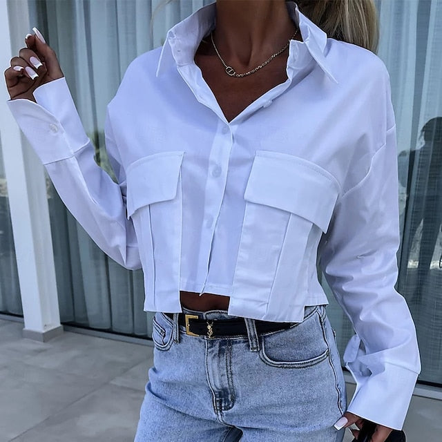 Gender: Women's, Tops Type: Button Up Shirt, Casual Shirt, Shirt, Blouse, Fabric: Polyester, Occasion: Streetwear, Daily, Holiday, Design: Pocket, Buttons, Style: Vacation, Fashion, Daily, Fit Type: Form Fit, Neckline: Turndown, Sleeve Length: Long Sleeve, Sleeve Type: Batwing Sleeve, Elasticity: Inelastic, Look After Me: Washable, Wet and Dry, Machine wash, Top Length: Crop Tops, Pattern: Solid Color, Plain, Season: Summer, Winter, Fall, Spring,