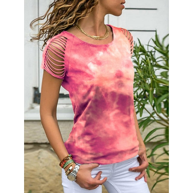 Fabric: Polyester, Tops Type: Tee Top, T Shirt, Gender: Women's, Design: Print, Hole, Occasion: Weekend, Going out, Daily, Style: Fashion, Casual, Stylish, Classic, Category: T-Shirt, Fit Type: Regular Fit, Neckline: Crew Neck, Sleeve Length: Short Sleeve, Elasticity: Micro-elastic, Look After Me: Washable, Hand wash, Machine wash, Top Length: Regular Tops, Pattern: Tie Dye, Season: Spring, Summer,