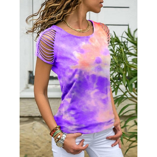 Women's T Shirt Tee Top Print Hole Tie Dye Fashion Stylish