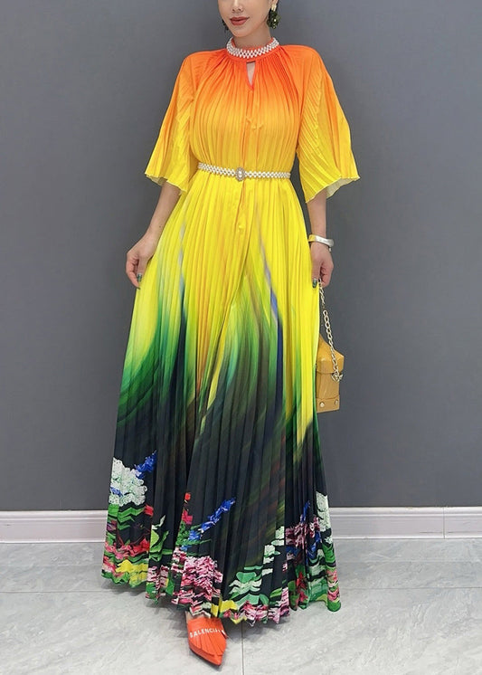 2024 Summer Fashion Orange Yellow Color Blocked Long Pleated Dress AO1020