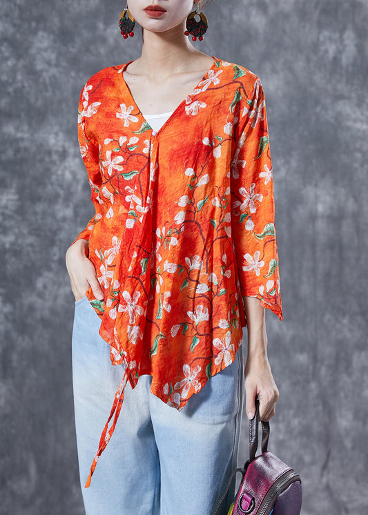 Elegant Orange Flower Print Lace Up Cotton Shirt Tops Bracelet Sleeve LY4080