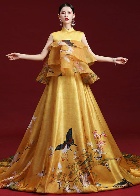 Elegant Yellow Stand Collar Print Ruffled Silk Maxi Dresses Sleeveless ML1564