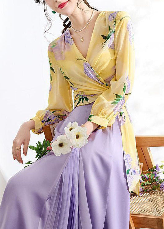 Elegant Yellow V Neck Wrinkled Print Patchwork Chiffon Top Spring LY3856