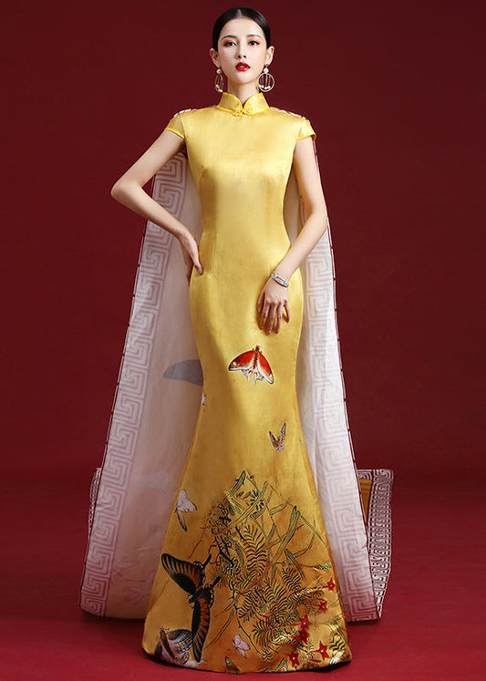 Elegant Yellow Stand Collar Patchwork Side Open Silk Dress Summer LY0146