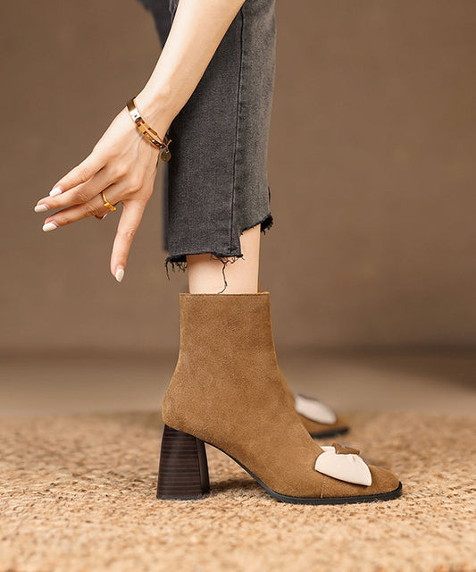 French Square Toe Thick Heel Bow Splicing Brown Suede Boots ML1719