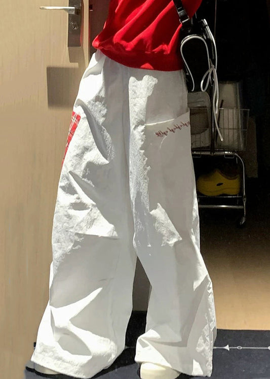 Patchwork Pockets Fall French White Cotton Plaid Pants