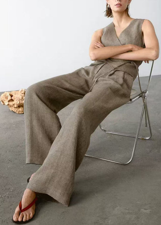 Khaki Linen High Pants Wide Waist Button Leg New Fall
