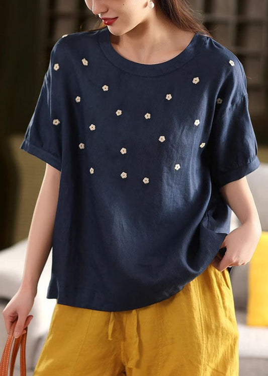 Tie Neck Casual Embroidered Sleeve Half Linen Blouses Yellow
