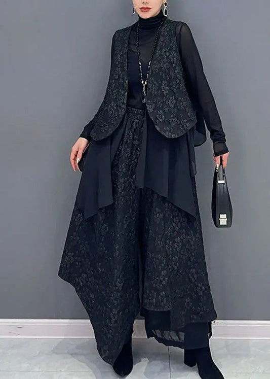 Art Black V Neck Print Waistcoat And Wide Leg Pants Two Pieces Set Fall ML3161
