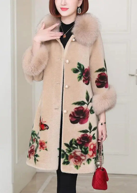 Classy Beige Peter Pan Collar Pockets Print Woolen Coats Winter ML2713