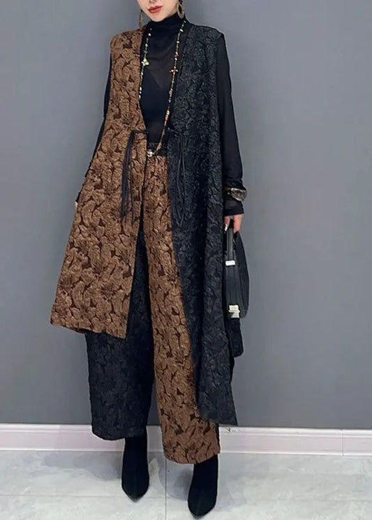 Classy Black Patchwork Brown V Neck Waistcoat And Wide Leg Pants Two Pieces Set Fall ML3165