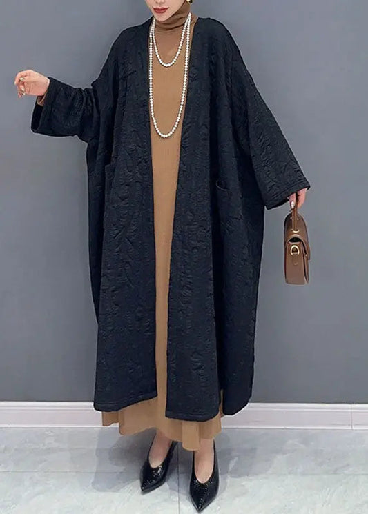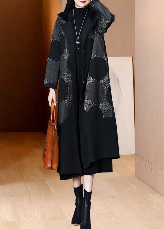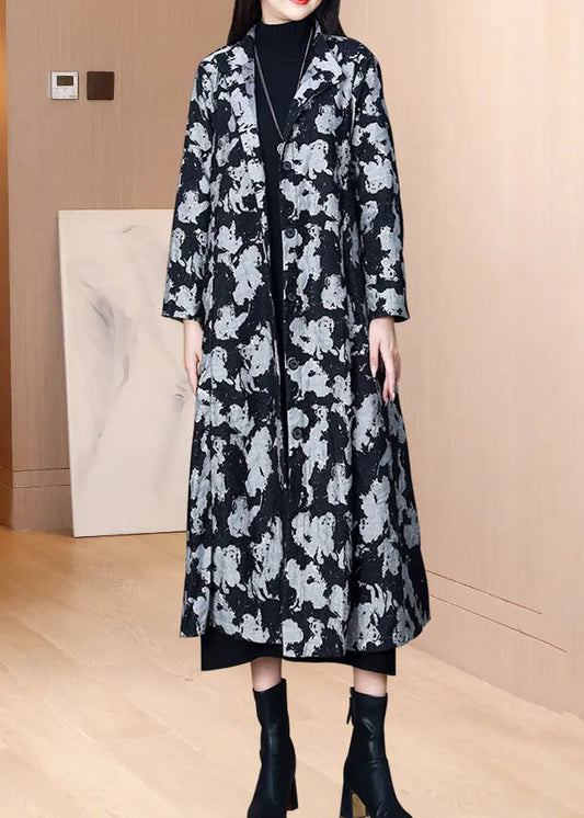 Vintage Black Asymmetrical Print Long Trench Coats Long Sleeve ML3166