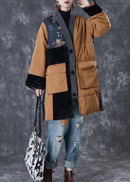 Elegant Coffee V Neck Patchwork Pockets Fine Cotton Filled Jackets Winter ML2996