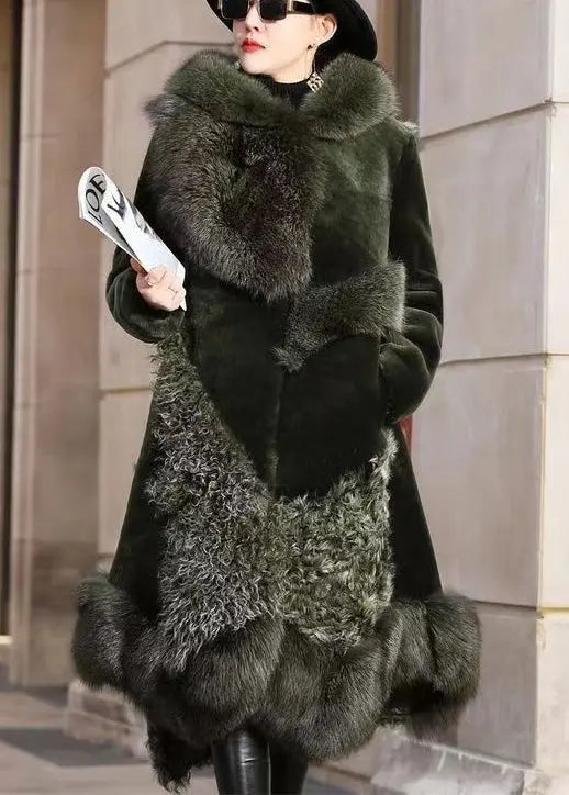 New Blackish Green Pockets Fox Collar Patchwork Fuzzy Fur Coats Winter ML2737