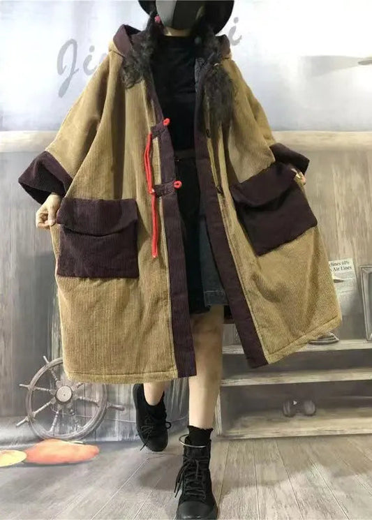 Plus Size Camel Hooded Pockets Patchwork Corduroy Warm Fleece Coat Winter ML2738