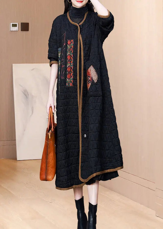 Vintage Black O Neck Pockets Patchwork Fine Cotton Filled Coat Winter ML2716