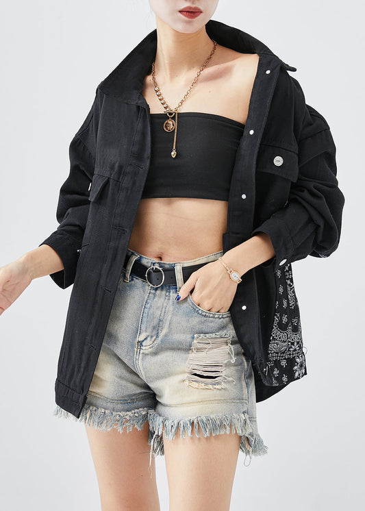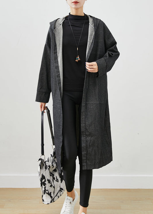 Black Oversized Denim Trench Coats Hooded Pockets Fall ML1931