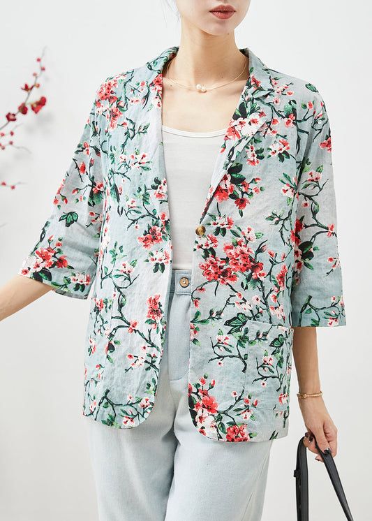 Women Slim Fit Plum Blossom Print Pockets Linen Coats Half Sleeve ML1953