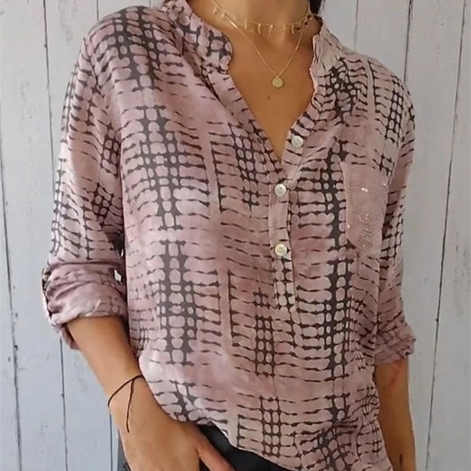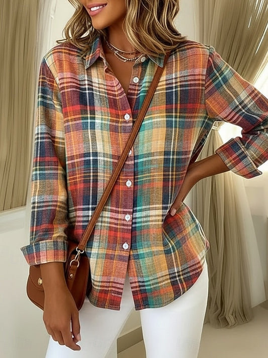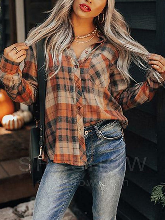 Women's Blouse Buttons Print Plaid Stylish Casual Long