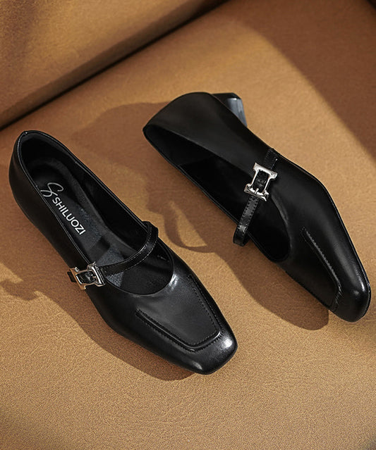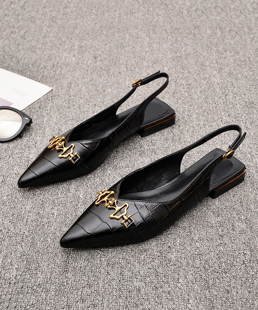 Black Pointed Toe Chunky Shoes Splicing Cowhide Leather