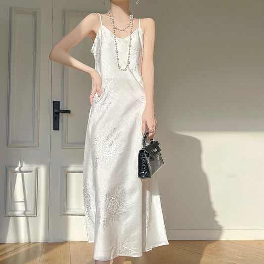 Spaghetti Strap V-Neck Satin Maxi A-Line Dress