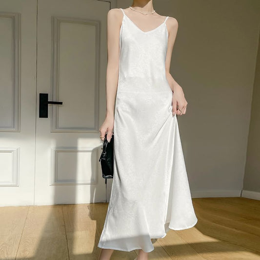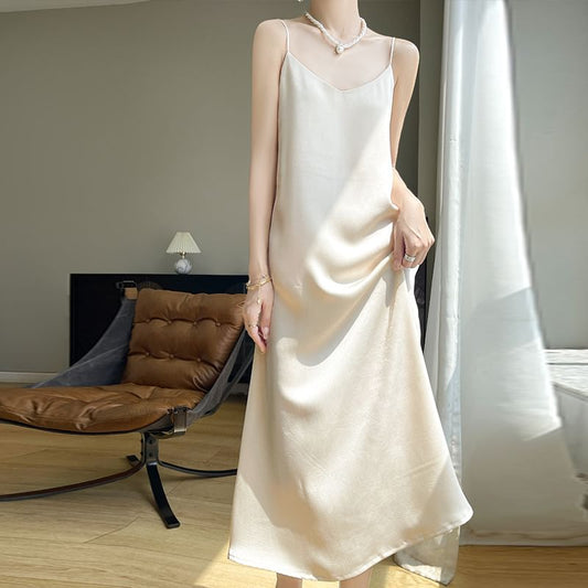 Spaghetti Strap V-Neck Plain Open Back Satin Maxi A-Line Dress
