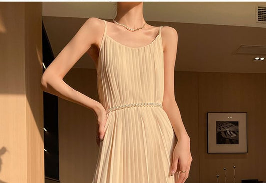 Spaghetti Strap Plain Maxi Pleated Dress