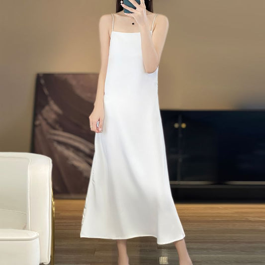 Spaghetti Strap V-Neck Satin Midi A-Line Dress