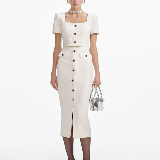 Short Sleeve Square Neck Plain Bow Slit Button Midi Sheath Dress