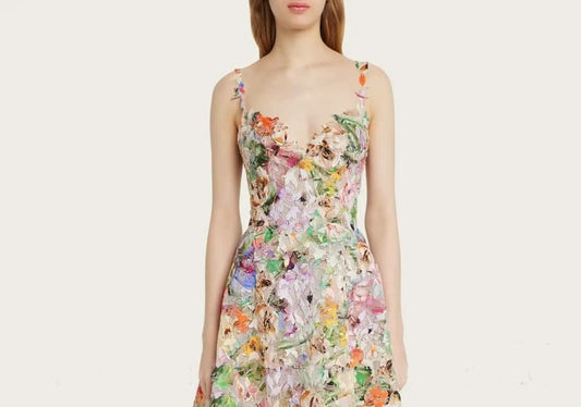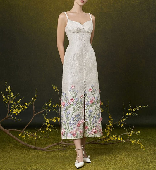 Spaghetti Strap Sweetheart Neck Floral Print Applique Button Slit Jacquard Maxi A-Line Dress
