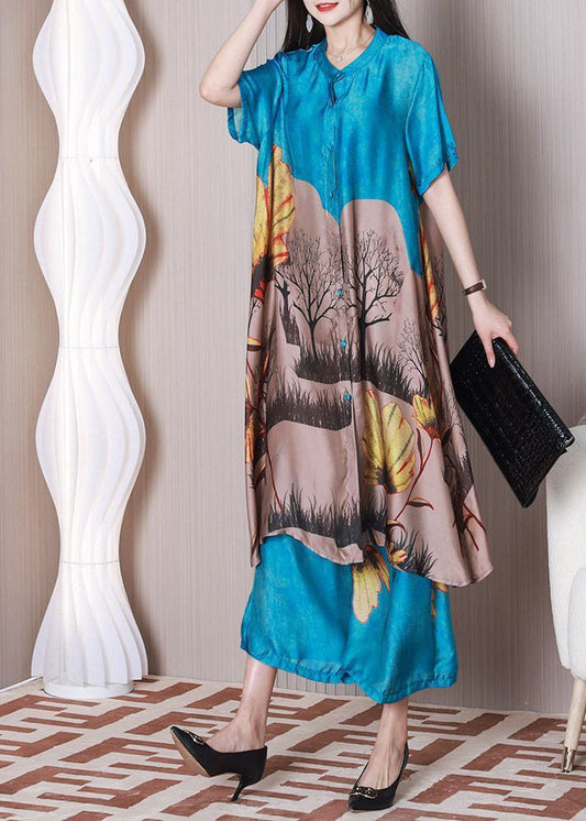 Art Blue Stand Collar Print Draping Silk A Line Dress Two Pieces Set Summer LY3767